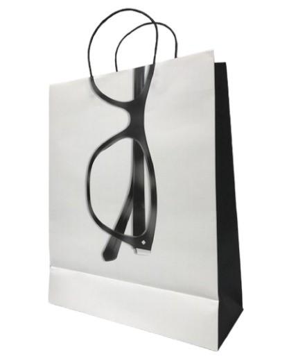 Bolsa de papel blanca imagen de gafa - material: papel kraft - Gramaje 140 gr/m2 - Tamaño: 250x100x310mm - Personalizable.
