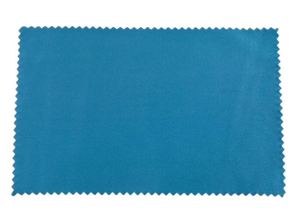 Gamuza en microfibra de alta gama PERSONALIZABLE. Color: azul ópalo. Tamaño: 10cm x 15cm. Gramaje 220 gr. Acabado en zig-zag. *** Los colores pueden variar durante el proceso de fabricación y no ajustarse a los de las fotos ***
