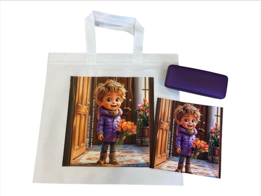 Pack bolsa NON-WOVEN de 70 gr. asas cortas reforzadas, medidas: 38x35 cm con la imagen marcada a una cara en digital + estuche marcado en láser en interior o exterior con la frase del día de la madre + gamuza microfibra marcada a una cara en digital con la misma imagen de la bolsa. tamaño 15x18 .