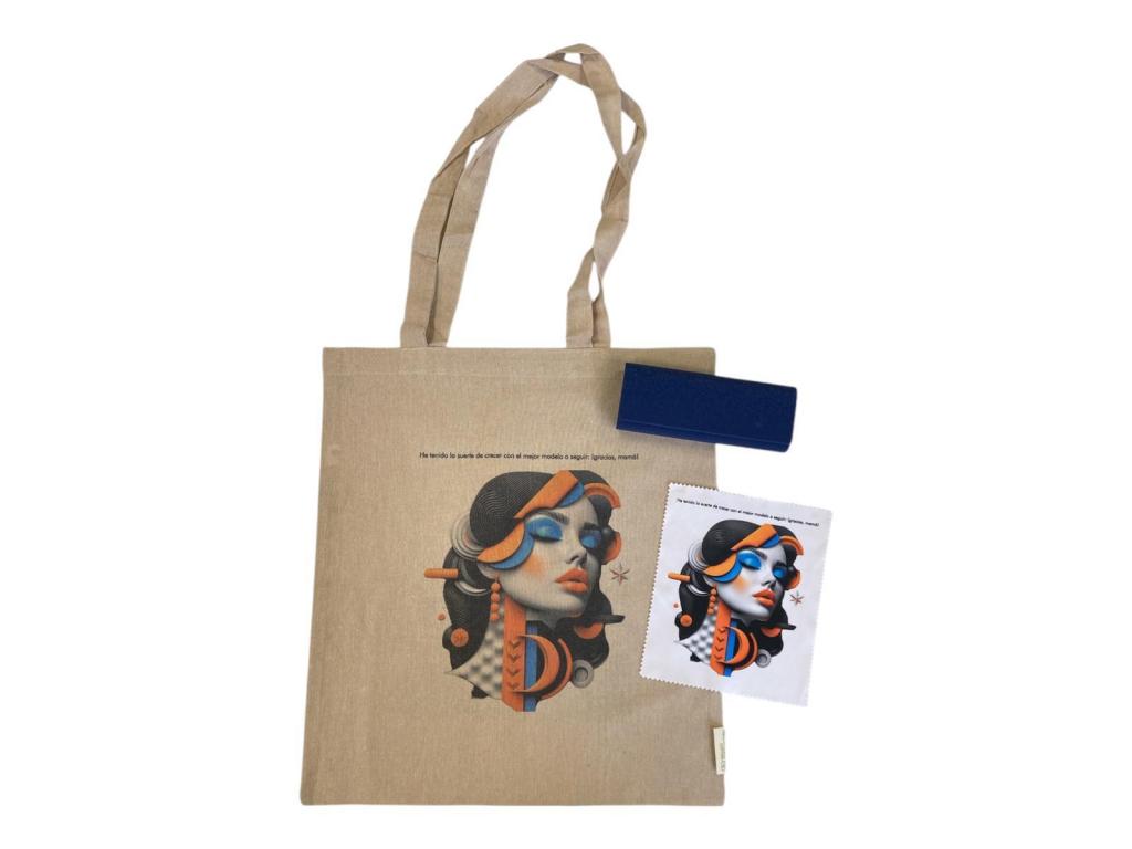 Bolsa en algodón reciclado, resistente hasta 8 kg. asas largas reforzadas de 70cm. medidas: 38x42 cm con la imagen marcada a una cara en digital + estuche marcado en láser en interior o exterior con la frase del día de la madre + gamuza microfibra marcada a una cara en digital con la misma imagen de la bolsa. tamaño 15x18 .