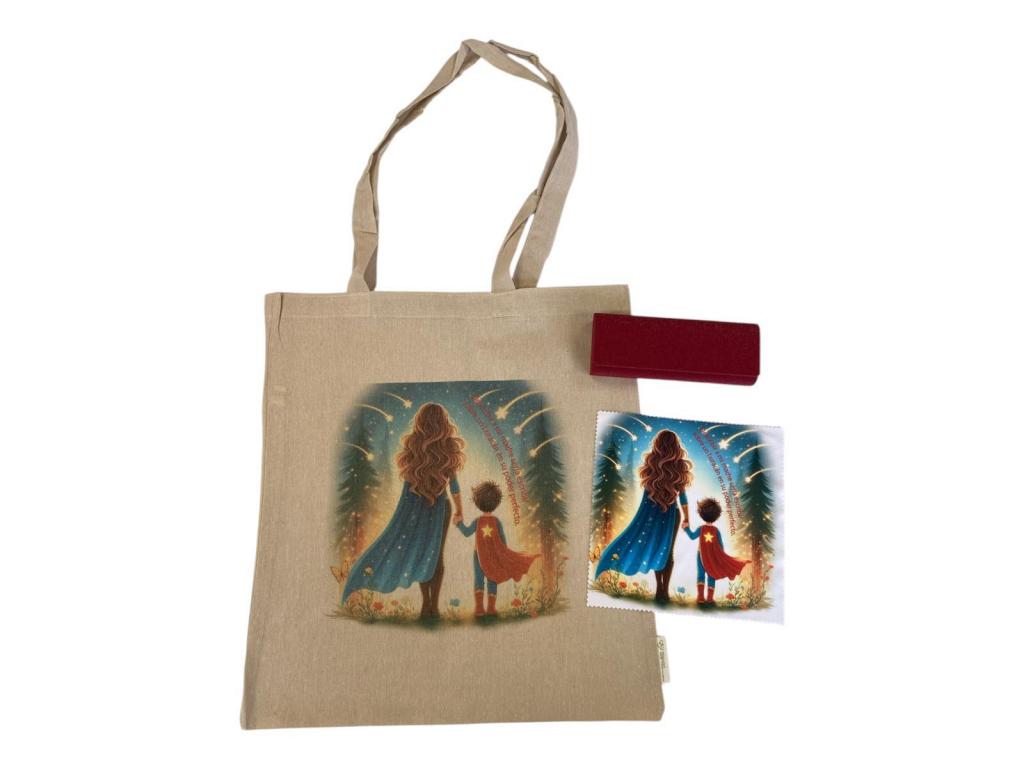 Bolsa en algodón reciclado, resistente hasta 8 kg. asas largas reforzadas de 70cm. medidas: 38x42 cm con la imagen marcada a una cara en digital + estuche marcado en láser en interior o exterior con la frase del día de la madre + gamuza microfibra marcada a una cara en digital con la misma imagen de la bolsa. tamaño 15x18 .