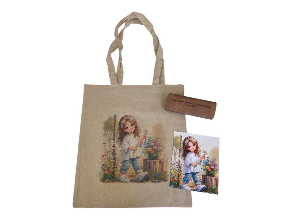 Bolsa en algodón reciclado, resistente hasta 8 kg. asas largas reforzadas de 70cm. medidas: 38x42 cm con la imagen marcada a una cara en digital + estuche marcado en láser en interior o exterior con la frase del día de la madre + gamuza microfibra marcada a una cara en digital con la misma imagen de la bolsa. tamaño 15x18 .