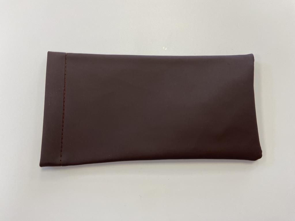 Estuche de PVC en color marrón oscuro con apertura de flexo en la parte superior. Dimensiones: 18cm x 8.8cm