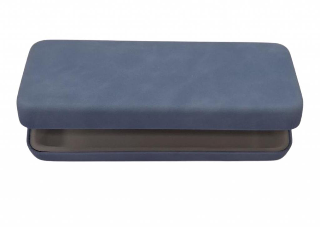 Modelo Amber . Estuche Amber metálico forrado en polipiel en color azul y el interior en color gris. Medidas: 158x63x32 Personalizable.