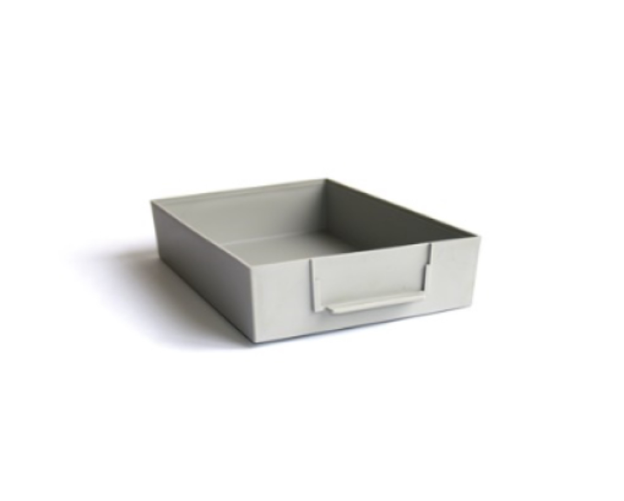 Grey job tray. Recyclable plastic, with separate divisions for lenses and small parts. With label pocket and grip tabe size: 224 x 162 x 50