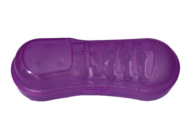 High end rigid plastic, 10 units. Clear mauve color. White inner color. Sneaker like case. Measurements: 157cm x 54cm x 40cm. Possible to customize