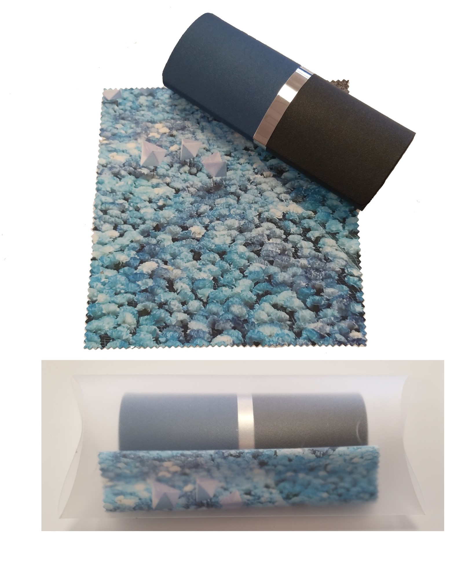Modelo Rulo. Estuche metálico forrado en polipiel con cierre magnético. Medidas: 16 X 6 X 35. Color: Azul marino/negro con embellecedor metálico en el centro. *** Incluye gamuza digital con imagen en doble cara tamaño 18x18 250 gsm + caja transparente de regalo.
