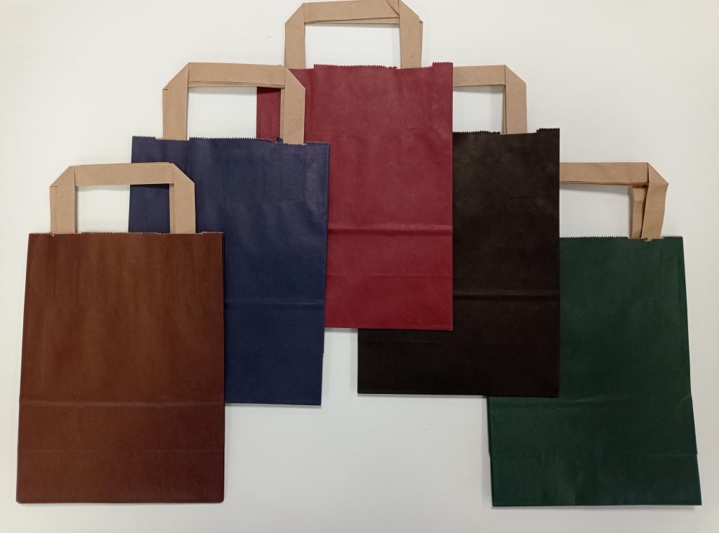 Caja con 500 Bolsas Kraft - material: papel Kraft - Gramaje 80 gr/m2 - Tamaño: 18x23.5x9 cm -Colores de fondo sobre liso reciclado con asa Kraft: marrón, azul marino, burdeos, negro, verde. APTA PARA PERSONALIZAR. Soliciten sin compromiso nuestros precios de estampación. Mínimo 500 unidades por color. ** ESCOGER COLOR ***