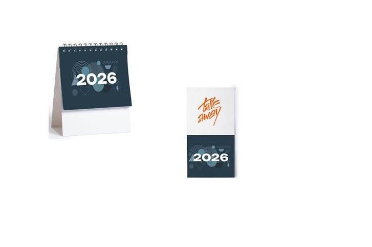 Calendario de sobremesa de anillas con cuerpo triangular en cartón. Diseño mes en curso/ mes anterior/ mes siguiente y santoral. Amplia superficie de marcaje en ambas caras. . Consultar precios