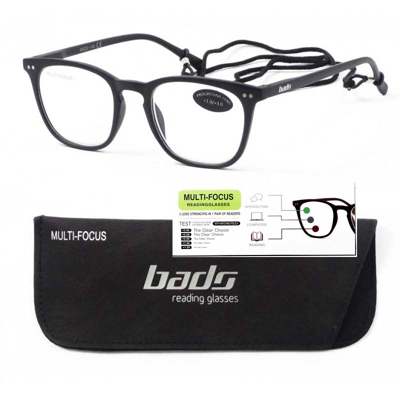 Gafa de lectura de pasta con adorno de metal en frontal.Incluye funda, cordón y caja presentación. Medidas: 53x16 largo de varillas 143. MULTIFOCUS - PROGRESIVAS para hipermetropía, presbicia/lectura. Lentes Antireflejantes. La gafa multifocus Bads es la gafa de lectura más versátil del mercado. Sus 3 zonas de enfoque permiten no tener que quitárselas para caminar o desplazarse, mantener una conversación, durante la cena, etc. Puede llevarlas siempre puestas excepto en la conducción de vehículos. 3 zonas de visualización: - Arriba, distancia larga. - Medio, distancia media / ordenador. - Abajo, lectura. . Una opción excelente a las gafas progresivas.