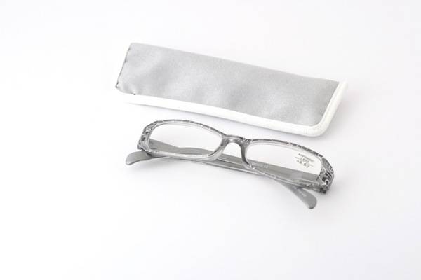 Lectores en acetato. Color gris plata con estampado brillante. Medidas ancho, 52mm /alto,27mm / puente, 19mm. Estuche semi rígido a juego.