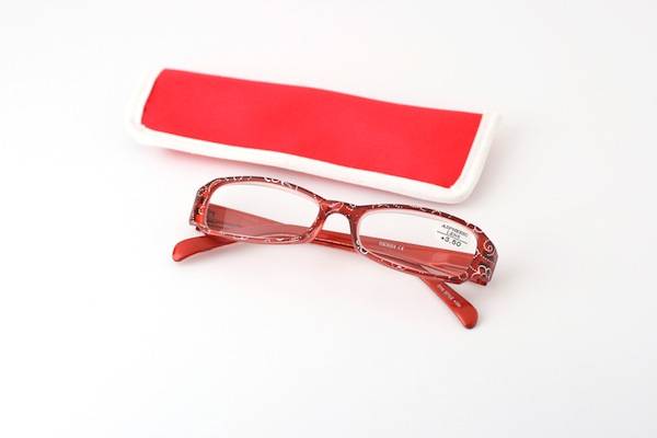 Lectores en acetato. Color rojo con estampado brillante. Medidas ancho, 52mm /alto,27mm / puente, 19mm. Estuche semi rígido a juego.