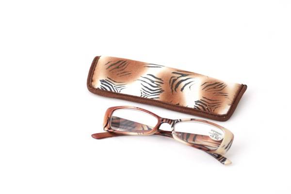 Lectores de acetato con estampado felino en tonos marrones y estuche a juego. Medidas: ancho,52mm/alto,25mm/puente,18mm.