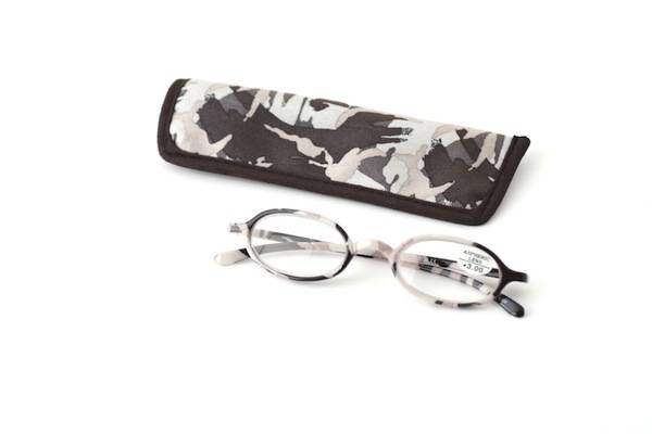 Lectores acetato. Estampado tipo camuflaje en colores negro y gris. Medidas: ancho, 45mm / alto,26mm / puente, 18mm. Estuche semi rígido a juego.