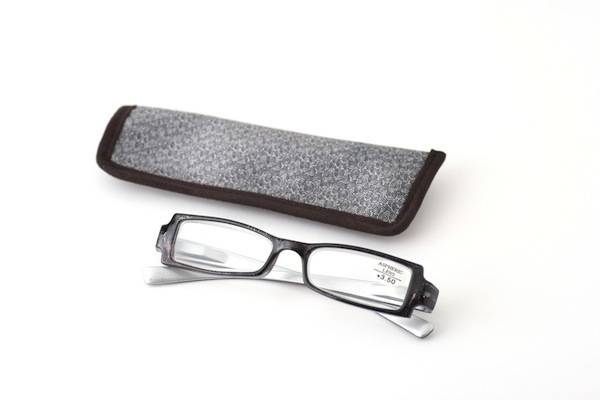 Lectores en acetato negro. Estampado en espirales grises. Medidas ancho, 48mm /alto,23mm / puente, 18mm. Estuche semi rígido a juego.
