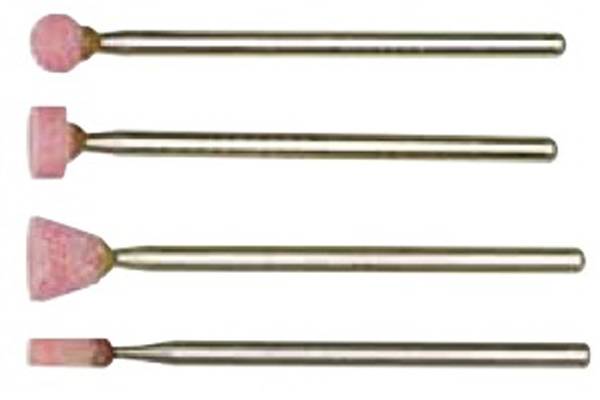 4 muelas surtidas de corindón. Medidas de las muelas: de 2.5 a 7 mm y Vástago de 2.35 mm de diámetro • Muelas para lijar. De diferentes formas para distintos acabados • Para hierro, acero y aleaciones