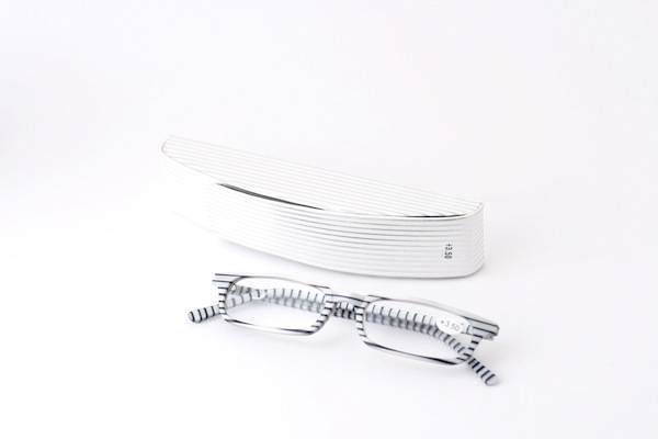 Lector estampado rayado en blanco y negro con estuche a juego. Medidas: ancho,50mm/alto,16mm/puente,18mm