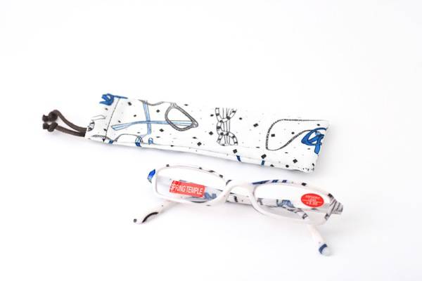 Lector en inyectado. Estampado de dibujos azules y negros sobre fondo blanco. Funda a juego. Medidas: ancho, 50mm / alto,22mm / puente,19mm.