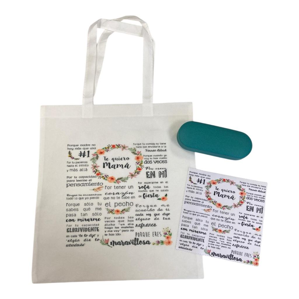 Pack bolsa NON-WOVEN de 80 gr. asas largas de 60 cm. y acabado cosido, medidas: 36x40 cm con la imagen marcada a una cara en digital + estuche marcado en láser en interior o exterior con la frase del día de la madre + gamuza microfibra marcada a una cara en digital con la misma imagen de la bolsa. tamaño 15x18 .