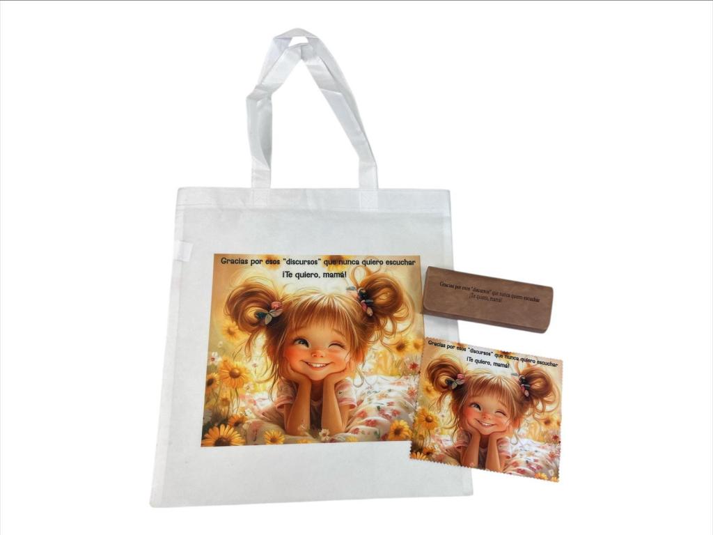 Pack bolsa NON-WOVEN de 80 gr. asas largas de 60 cm. y acabado cosido, medidas: 36x40 cm con la imagen marcada a una cara en digital + estuche marcado en láser en interior o exterior con la frase del día de la madre + gamuza microfibra marcada a una cara en digital con la misma imagen de la bolsa. tamaño 15x18 .