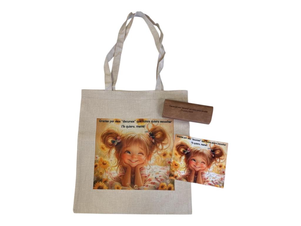 Bolsa resistente de poliéster , resistente hasta 8 kg. asas largas reforzadas de 70cm. medidas: 38x42 cm con la imagen marcada a una cara en digital + estuche marcado en láser en interior o exterior con la frase del día de la madre + gamuza microfibra marcada a una cara en digital con la misma imagen de la bolsa. tamaño 15x18 .