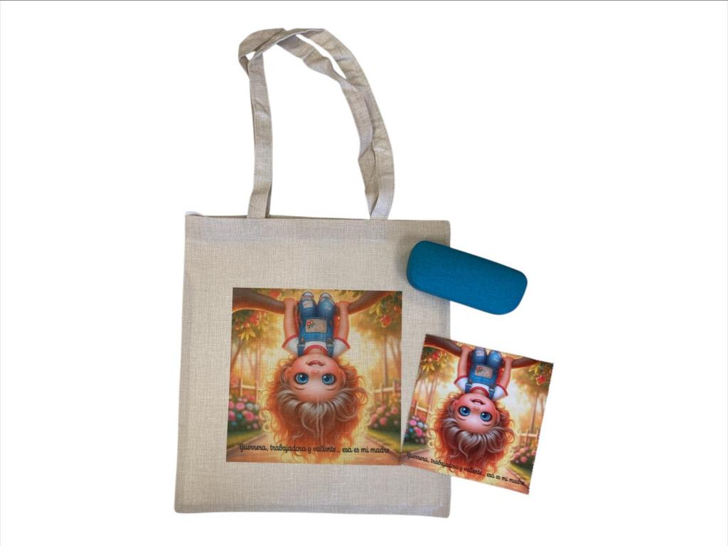 Bolsa resistente de poliéster , resistente hasta 8 kg. asas largas reforzadas de 70cm. medidas: 38x42 cm con la imagen marcada a una cara en digital + estuche marcado en láser en interior o exterior con la frase del día de la madre + gamuza microfibra marcada a una cara en digital con la misma imagen de la bolsa. tamaño 15x18 .