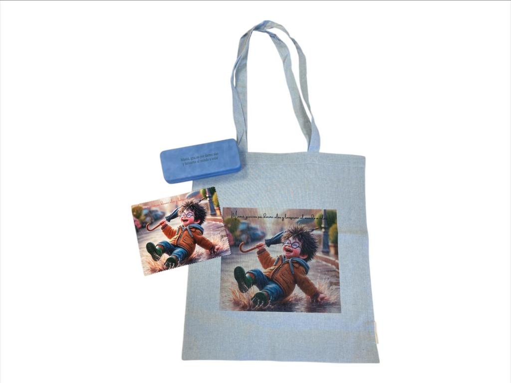 Bolsa en algodón reciclado, resistente hasta 8 kg. asas largas reforzadas de 70cm. medidas: 38x42 cm con la imagen marcada a una cara en digital + estuche marcado en láser en interior o exterior con la frase del día de la madre + gamuza microfibra marcada a una cara en digital con la misma imagen de la bolsa. tamaño 15x18 . Disponible en otros colores - consultar *