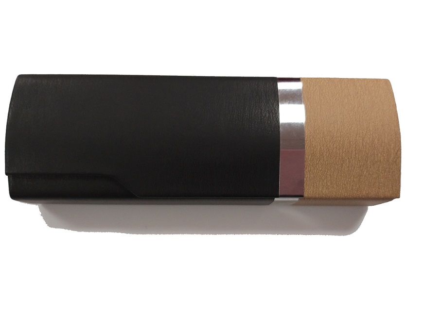 Modelo Man. Estuche metálico forrado en polipiel con cierre magnético. Medidas: 155 X 50 X 34. Color: negro/arena con embellecedor metálico en el centro.