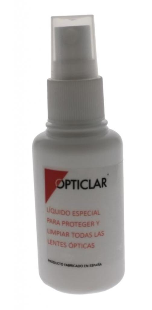 Limpiador para lentes ópticas OPTICLAR. Apto para todo tipo de tratamientos de lentes. Tiene un efecto antivaho de corta duración. Botella de 50ml con sistema de pulverizador recargable.