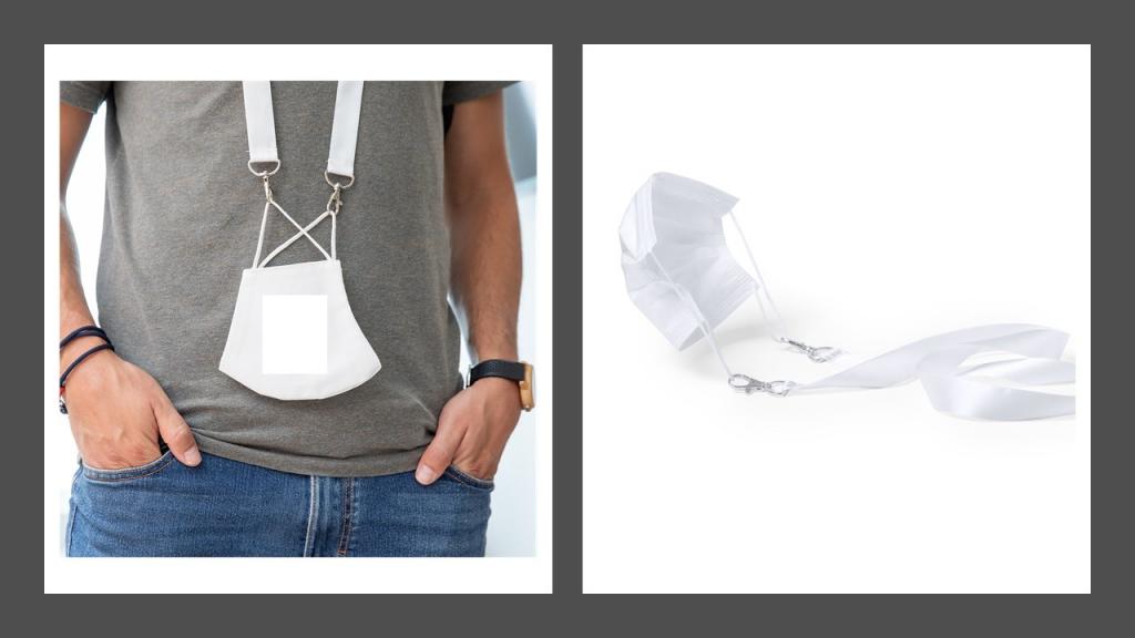 Cinta portamascarillas en suave poliéster de color blanco. Indicado para todo tipo de mascarillas, incorpora dos mosquetones de seguridad en los extremos para enganche de las bandas elásticas de la mascarilla, permitiendo transportarla cómodamente y sin molestias. Al mismo tiempo, proporciona un rápido y fácil acceso a la mascarilla cuando es necesario usarla. Cinta con ancho especial para un cómodo ajuste, Apta para la personalización Medida:2.6 x 39 x cm | 16 gr.