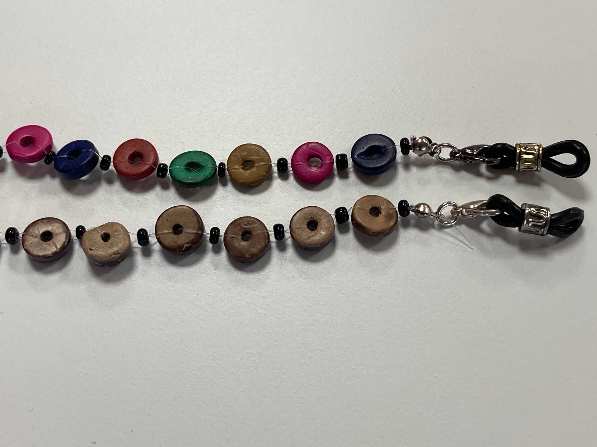 Cadena modelo Bali en madera. 63cm de largo. Además de tener el adaptador para las varillas de las gafas, lleva un gancho metálico apto como porta mascarillas y uniendo ambos extremos se puede convertir en collar.