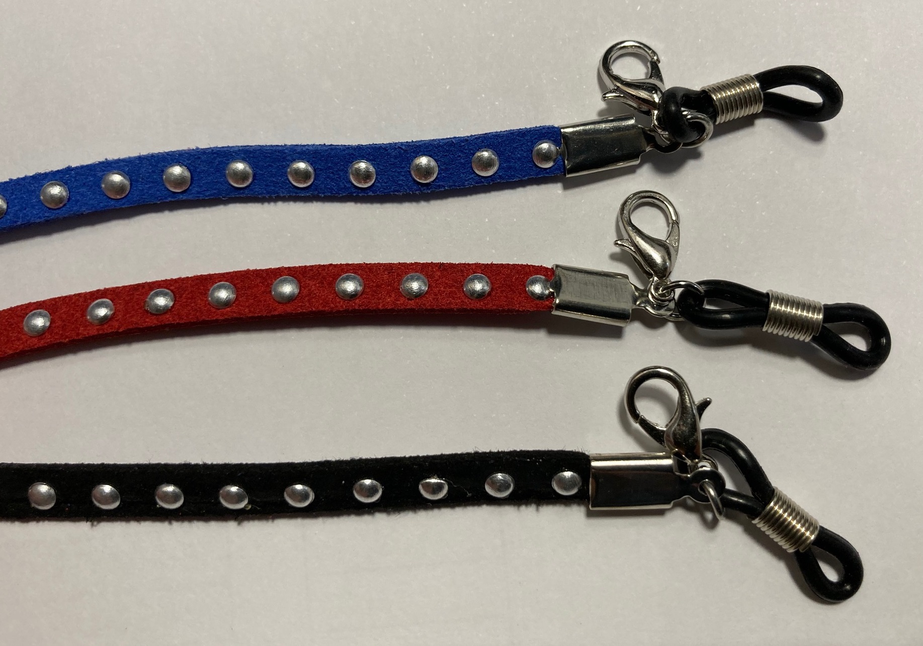 3 Cordones de piel en color azul, rojo y negro con tachuelas plateadas. Además de tener el adaptador para las varillas de las gafas, lleva un gancho metálico apto como porta mascarillas. Largo de 68 cm.
