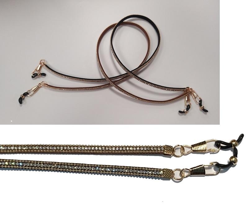2 Cordones en piel con incrustaciones de brillantes fantasía. Además de tener el adaptador para las varillas de las gafas, lleva un gancho metálico apto como porta mascarillas. Largo de 60cm
