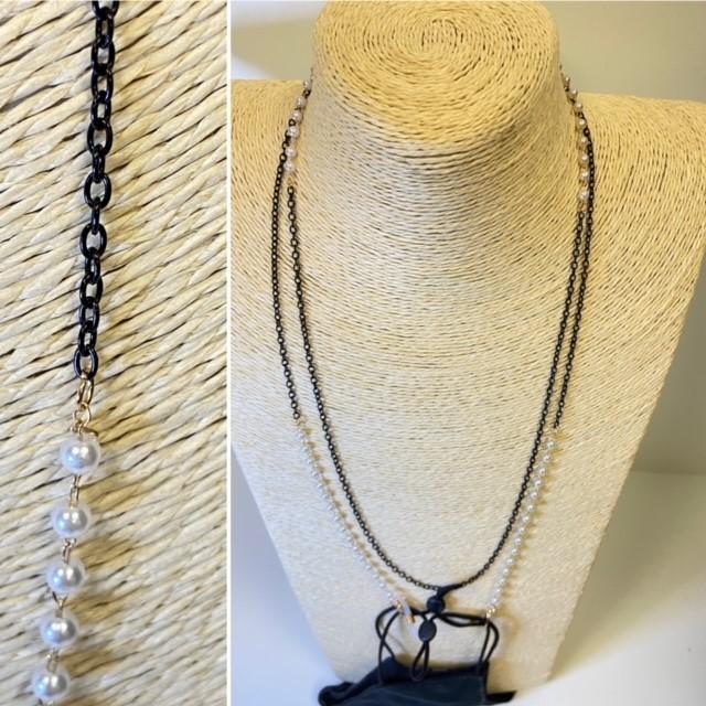 Cadena portamascarillas Estambul color negro con perlitas. Además de tener el adaptador para las varillas de las gafas, lleva un gancho metálico apto como porta mascarillas. Largo 67 cm.