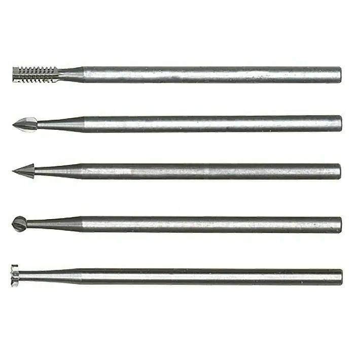 5 fresas surtidas de tungsteno vanadio. Medidas de las fresas: De 2.3 a 3.1 mm. Vástago de 2.35 mm de diámetro.• Vástago y fresas de una sola pieza, especiales para metales (no férricos) y plásticos