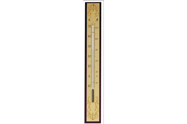 • Termómetro en madera de caoba con aluminio • Medición de grados de -10º a +50º • Dimensiones: 3,5cm de ancho x 29cm de alto