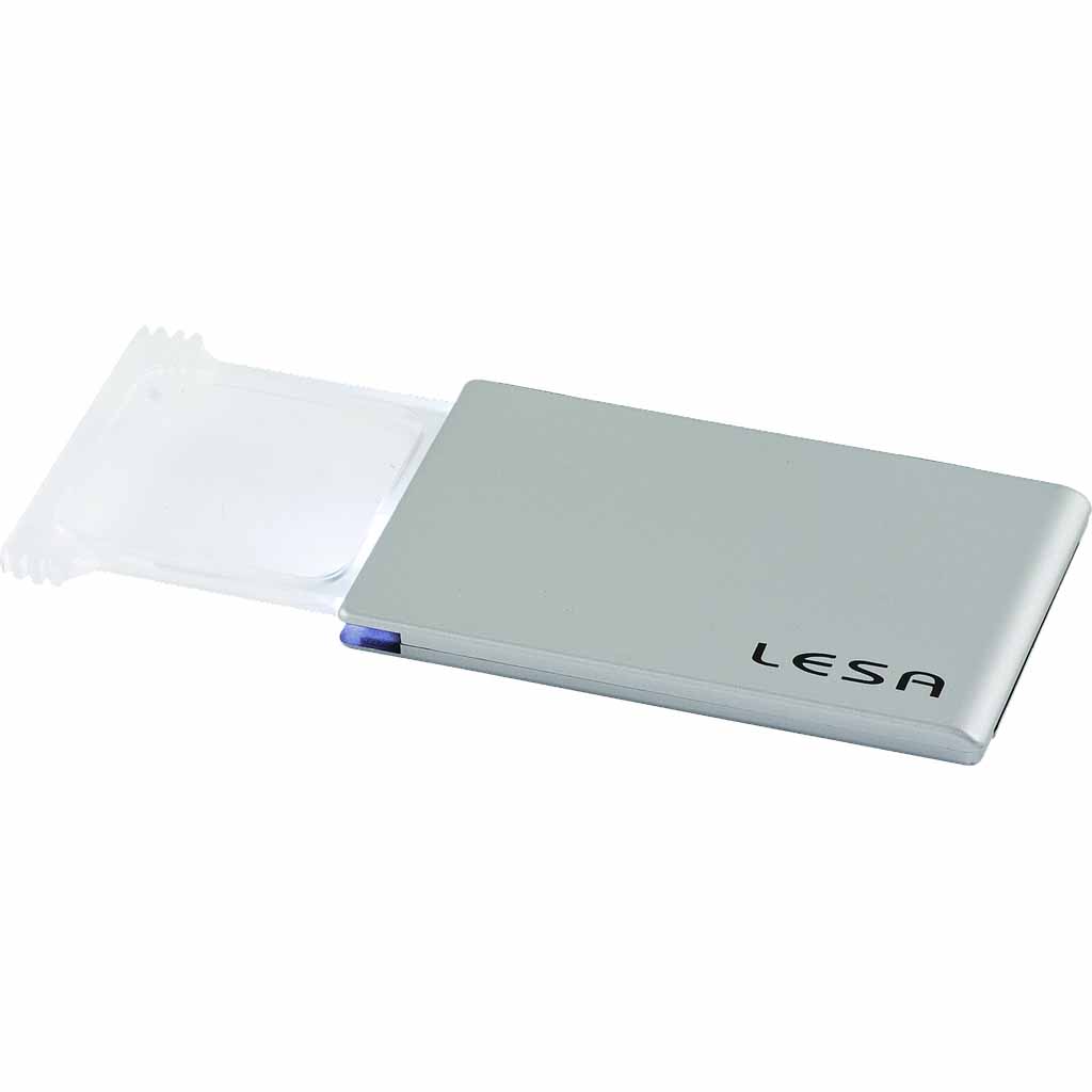 Lupa de bolsillo extra plana con luz LED de 4 dioptrías, 3 aumentos medidas: 95x56 mm.