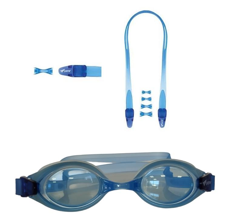 Kit para lentes correctivas natación en color azul claro. Cinta regulable de silicona. Clip lateral. Puente nasal de 24mm de T.P.E. (elastómero termoplástico). Ajustador de correa de policarbonato. Cinta regulable • Incluye 3 puentes: 18 mm, 24mm y 28mm • Medidas: 35mm de ancho x 25mm de alto •Máxima calidad • Rango edad 6-12
